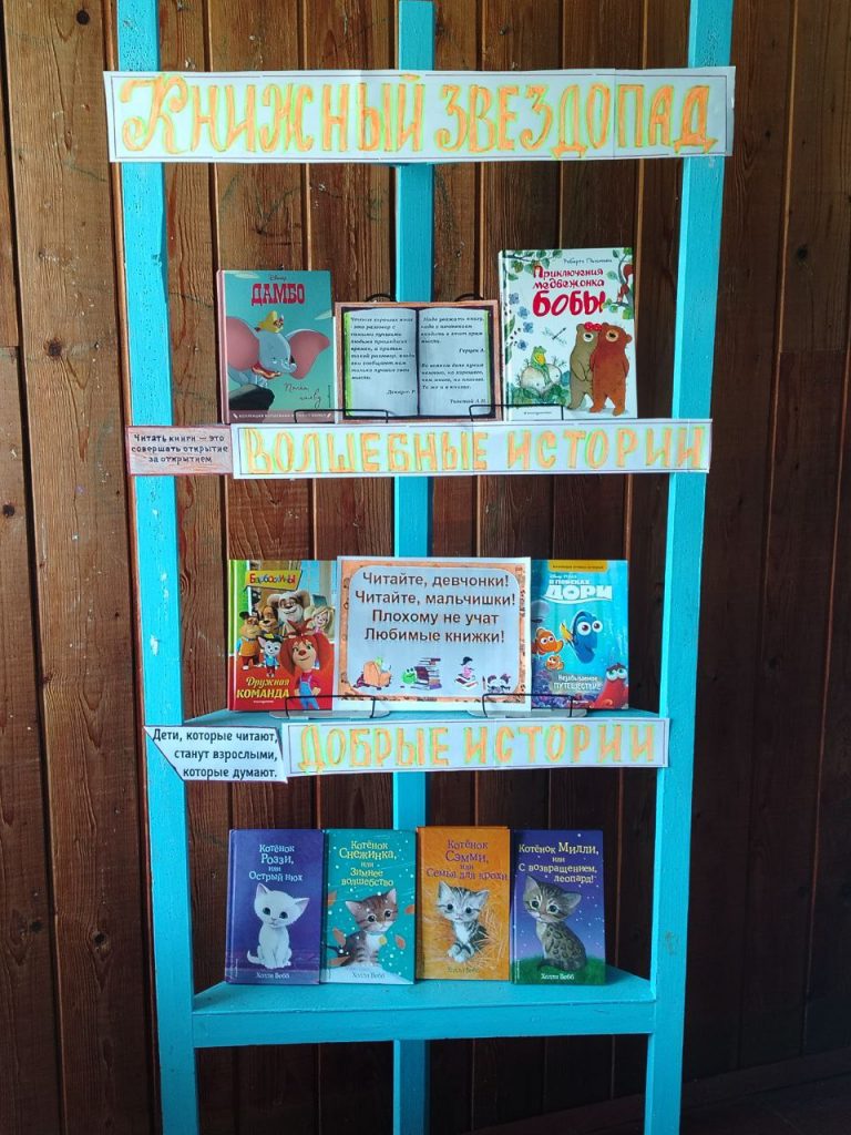 24 июля, в биб-ке с. Муравейка, была оформлена кн. выставка для детей :»Книжный звездопад»,на которой книги будут меняться каждую неделю. Открыв книгу «Барбоскины. Дружная команда»,